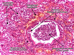 ν. Οι πνεύμονες είναι βαρείς, ζυμώδεις και ερυθροί. Από την ακρόαση, διακεκομμένοι μη μουσικοί ρόγχοι (τρίζοντες). Στην εικόνα διακρίνονται διευρυσμένα και συμφορημένα τριχοειδή, και κυψελίδες, με πλούσιο σε ινική και πρωτεΐνες εξίδρωμα.